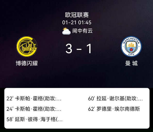 欧冠联赛阶段第7轮卡斯帕霍双响博德闪耀31曼城 01-21