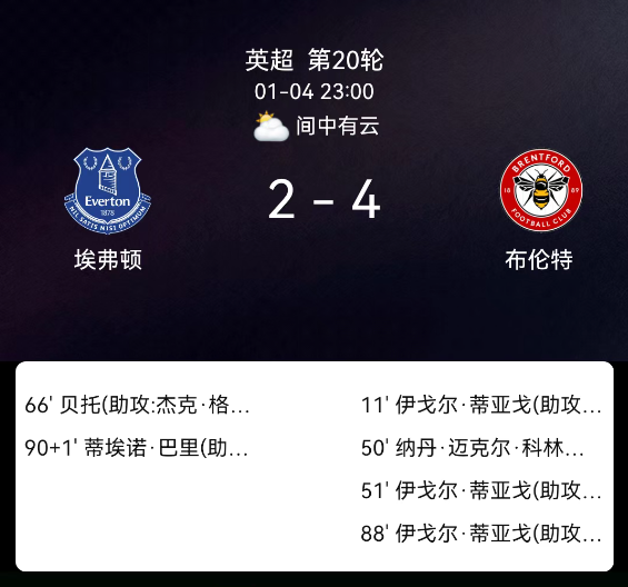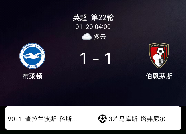 英超第22轮科斯图拉斯倒钩绝平布莱顿11逼平伯恩茅斯 01-21